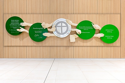 Fabian Schmid, ehemals an der Majolika Karlsruhe tätiger Künstler und Produktdesigner, hat die Ehrungssymbolik konzipiert und umgesetzt. Die Hände der Großspender wurden dazu gescannt, die Scans mittels 3-D-Druck in Ton geformt, der Ton anschließend gebrannt und die Hände naturgetreu gestaltet.