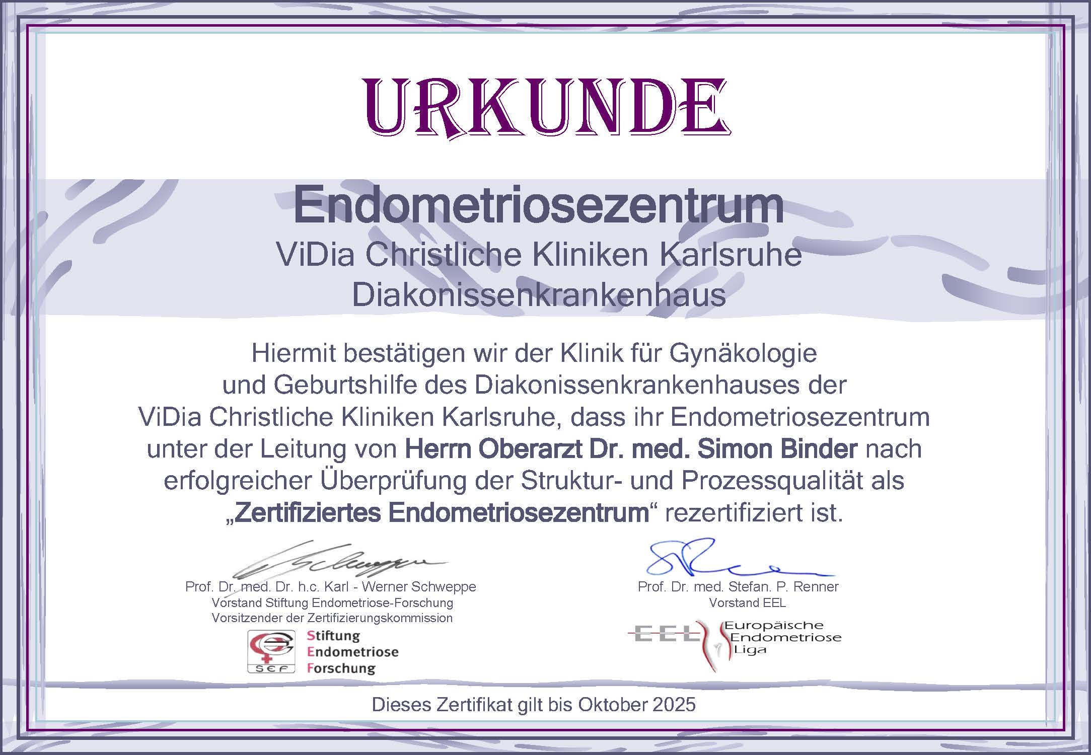 Um die höchste Behandlungs­qualität auf dem Gebiet der Endometriose zu garantieren, ist die Frauenklinik der ViDia Christliche Kliniken Karlsruhe als klinisch-wissenschaftliches Endometriose­zentrum (vormals Stufe III) durch die Stiftung Endometriose-Forschung (SEF) und die Europäischen Endometriose Liga (EEL) zertifiziert.